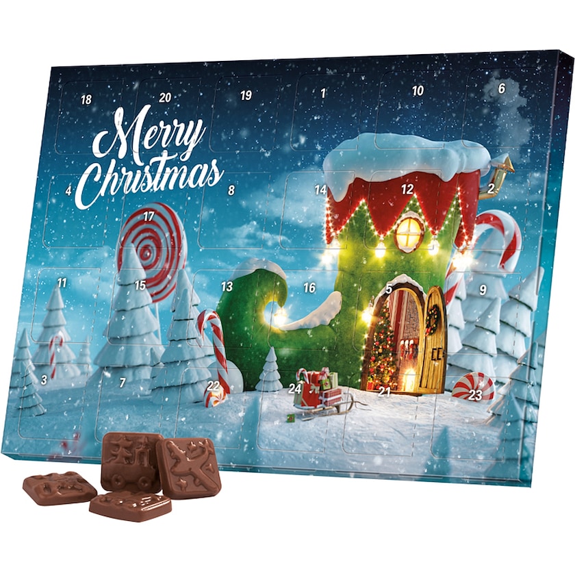 Julekalender til skrivebordet med velsmagende Fairtrade-chokolade. Chokoladen har en kraftig mælkechokoladesmag. Takket være en støtte på bagsiden kan juleskalenderen stå på skrivebordet.
