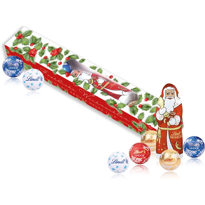 Chokoladeæske med prailiner og chokoladenisse fra Lindt. Lindt Christmas Parade indeholder 5 stk. Lindt Minis (ca. 22 gram) samt 1 stk. Lindt Chokolade Julemand (ca. 10 gram). Æsken trykkes helt efter dine ønsker.