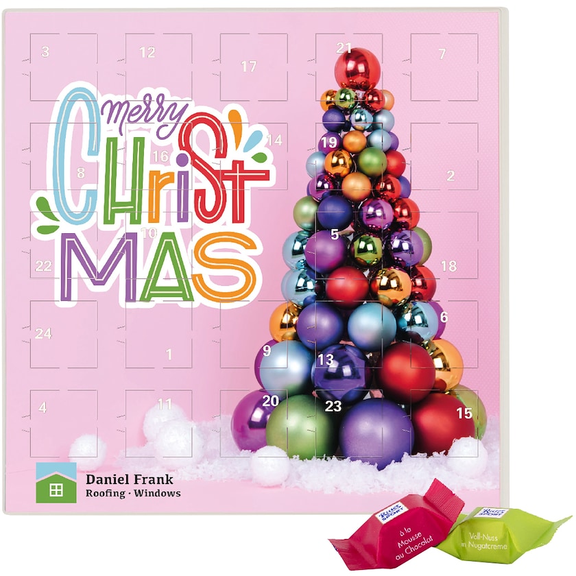 Kvadratisk julekalender med chokolade fra Ritter Sport. Julekalenderen indeholder 24 stk. Ritter Sport chokolade firkanter. Indlæg er komposterbar og hele produktionen er foretaget 100% klimaneutralt.