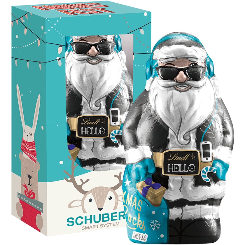 Trendy chokoladejulemand fra Lindt Hello-serien. Chokoladejulemanden er lavet af velsmagende mælkechokolade i bedste kvalitet. Nisserne leveres blandet i farverne blå og rød. Hele papemballagen trykkes efter dine ønsker.
