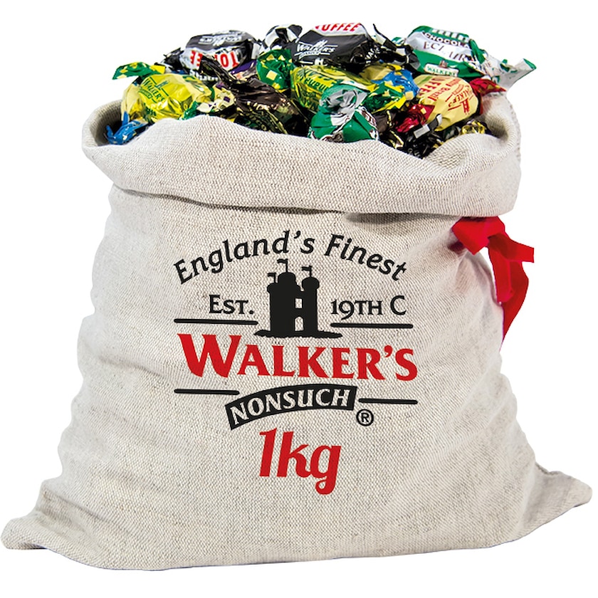 Julesæk fyldt med skønne karameller Walker's Nonsuch. Sækken indeholder 1000 gram karameller med smagene Nutty Brazil Toffee, English Creamy Toffee, Banana Split Éclair, Mint Chocolate Éclair, Milk Chocolate Éclair, Liquorice Toffee och Chocolate Toffee. Sækkene kan ikke kun forsynes med tryk men også med et kort med din logotype.