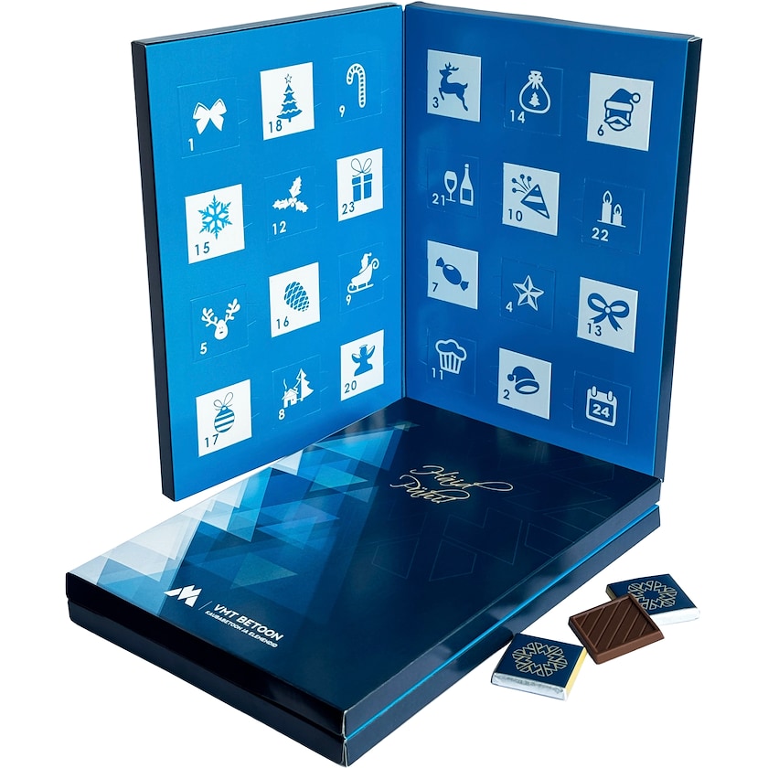 Julekalender i bogformat med chokolade kvadrater med logo. Både selve julekalenderen og chokolade kvadraterne trykkes efter dit ønske. Vælg mellem mælkechokolade eller mørk chokolade.