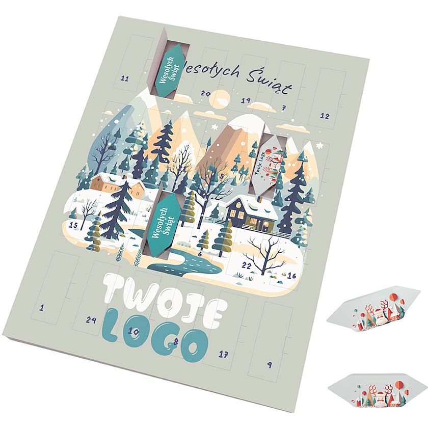Julekalender med 24 stk. lækre fudge. Vælg mellem smagene mælk og peberkagekaramel. Både selve julekalenderen og papiret omkring fudgen trykkes med dit design.