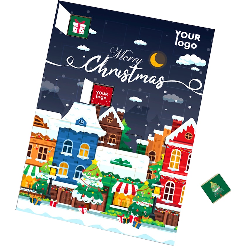 Julekalender med chokolade kvadrater med eget logo. Både selve julekalenderen og chokolade kvadraterne trykkes efter dit ønske. Du har derfor mulighed for at skabe en fuldstændig unik julekalender fyldt med udsøgt chokolade. Chokolade kvadraterne kan enten fås i mælkechokolade eller i mørk chokolade.