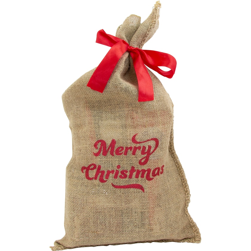 Stor jutesæk med rødt tryk "Merry Christmas". Juteposen indeholder mælkechokoladechips, skumnisser, marcipanpraliner, karamelkopper, kiks, safranmandler, choko & plus og to slags chokoladetrøfler.