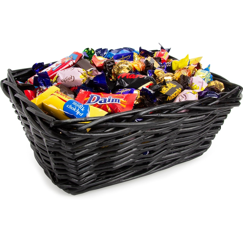 Sort kurv med indpakket kvalitetsslik. Indeholder klassikere som Toblerone, Dumle, Geisha og Daim. Hvis du ønsker det kan kurven forsynes med et julekort med julemotiv.