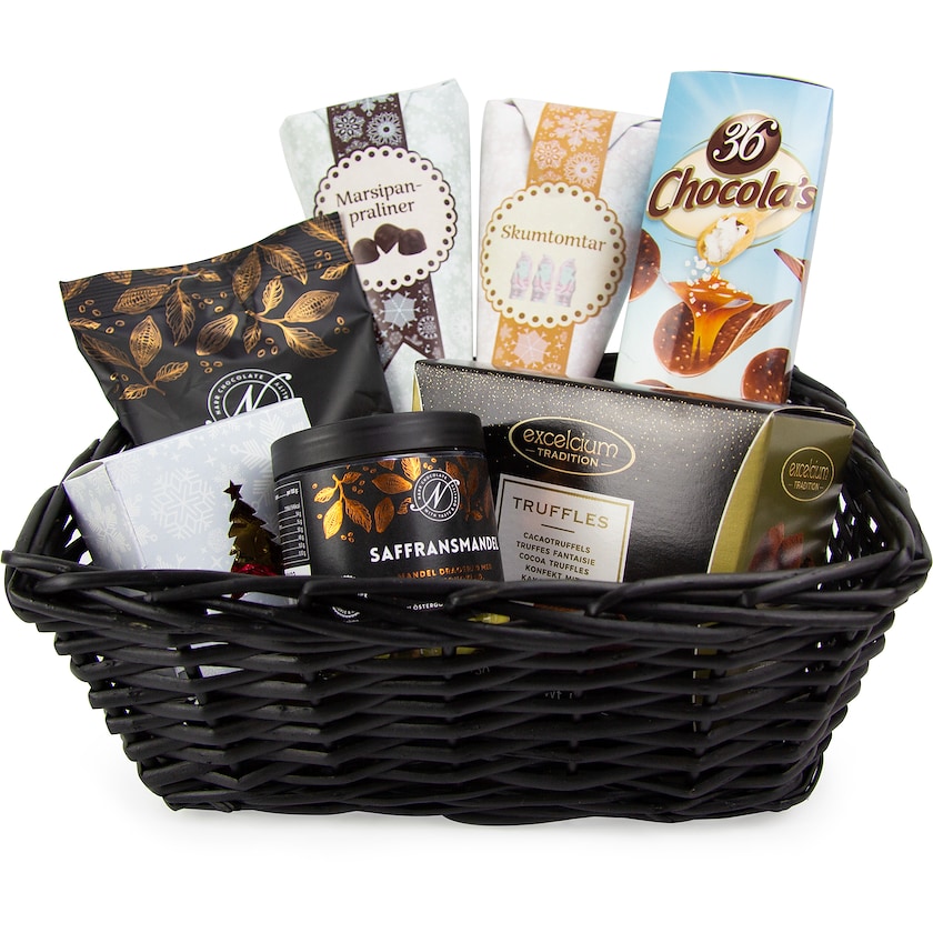 Eksklusiv julekurv med luksus slik. Indeholder mælkechokoladechips, skumfiduser, marcipanpraliner, pralinekugler, trøfler, safranmandler og salte maltcrisps. Som tilvalg kan du forsyne kurven med et lykønskningskort.