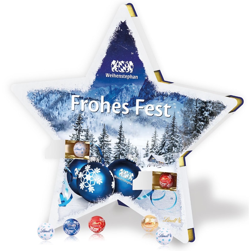 Miljøvenlig julekalender med logo formet som en stjerne. Julekalenderen indeholder 24 stk. lækre Lindt Minis. Kartonen er FSC-certificeret og indlæg er biologisk nedbrydelige. Hele produktionen er lavet klimaneutralt. Hele julekalenderen trykkes efter dine instruktioner.
