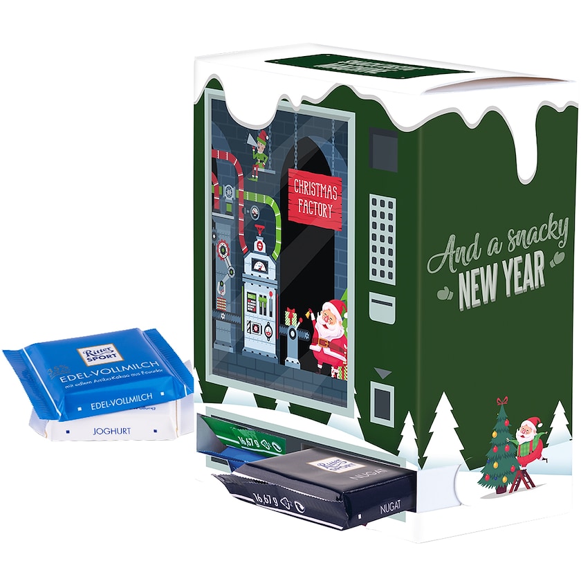 Unik julekalender med chokolade fra Ritter Sport. Julekalenderen har ingen traditionelle låger men i stedet tager du blot et stykke chokolade hver dag. Fremstillet af FSC-certificeret karton.