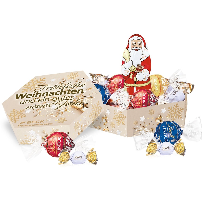 Chokoladeæske med luksuschokolade fra Lindt. Lindt Christmas Maxi Box indeholder 5 stk. Lindt Lindor, 5 stk. Lindt mælkechokolader samt 1 stk. Lindt julenisse. En perfekt julegave til vigtige kunder. Hele æsken trykkes efter dine ønsker.