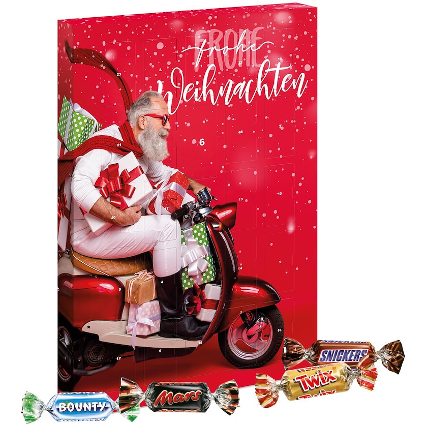 Chokoladekalender fyldt med Mars, Snickers, Bounty og Twix. En lækker chokoladeblanding som elskes af alle! Hele kalenderen trykkes efter dine ønsker.