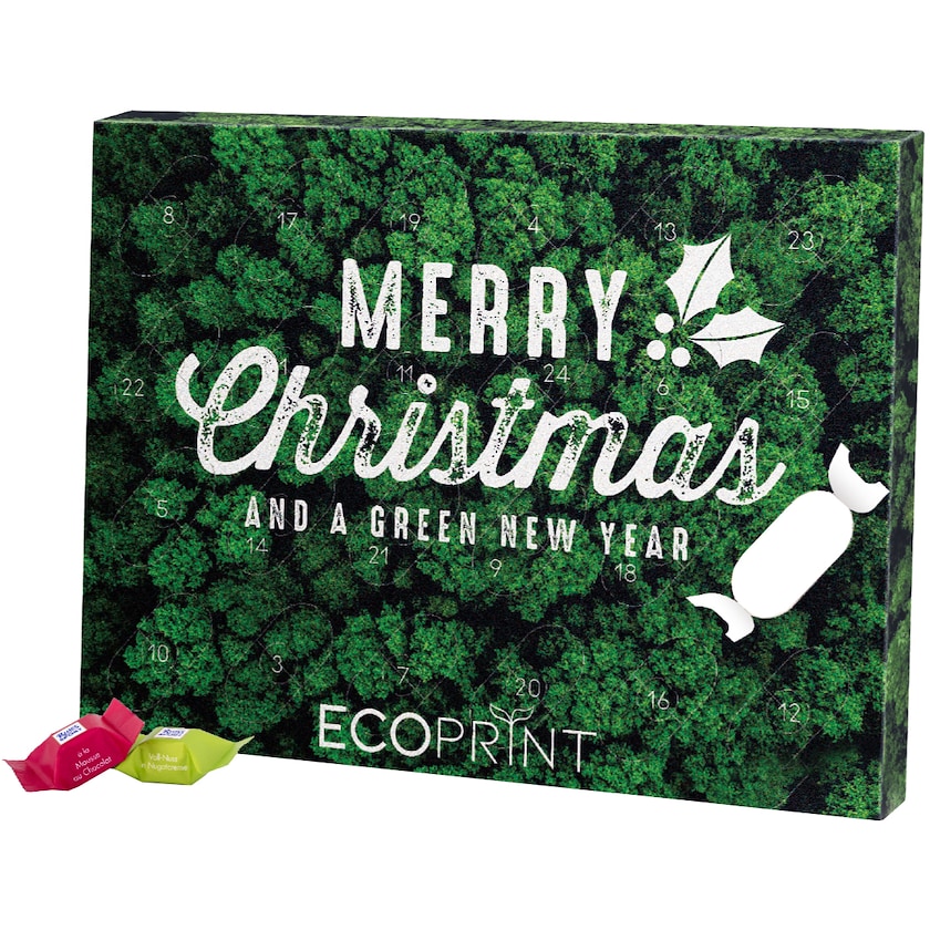 Miljøvenlig julekalender med chokolade fra Ritter Sport. Hele julekalenderen er fremstillet af papir og er dermed fuldstændig komposterbar som den er. Julekalenderen er fyldt med lækker chokolade af typen Ritter Sport Chocolate Cubes med blandet smag.