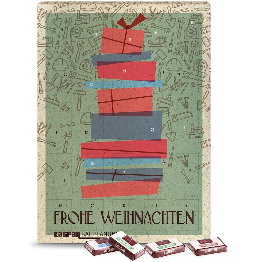 Julekalender med Fairtrade-certificeret chokolade fra Sarotti. Kalenderens ydre emballage er fremstillet af miljøvenligt græspapir og indlæg er fremstillet af genbrugsvenligt karton. Chokoladen kommer blandt andet i smagene Vollmilch, Gianduja, Haselnuss og Zartbitter. Julekalenderen er egnet til at hænge på en væg.