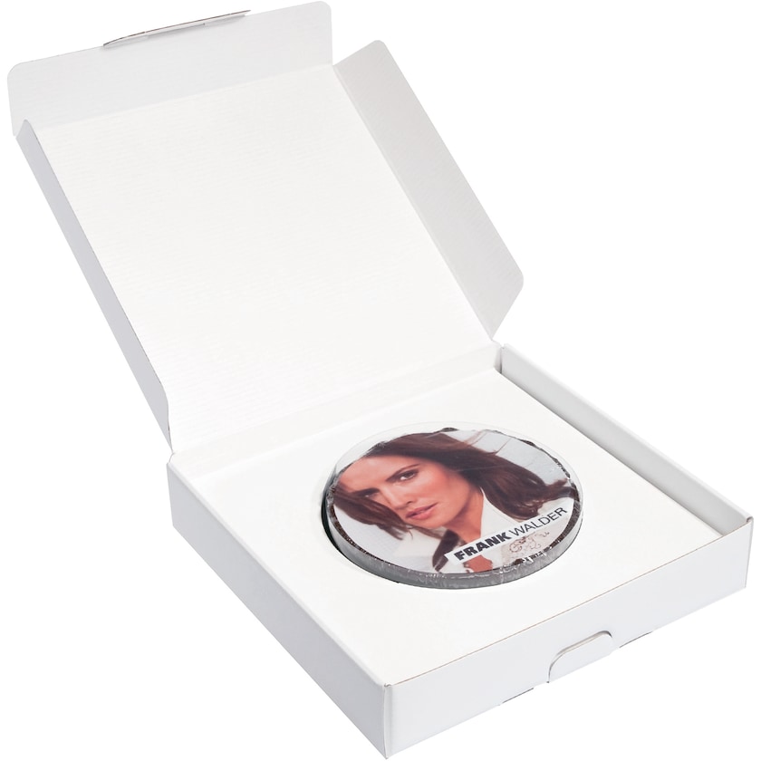 Kage med digitaltryk på den ene side, leveres i æske til postforsendelse. Kagen fås i smagene chokolade og appelsin. Trykket laves med bolchefarve på et tyndt sukkerlag. Holdbarheden regnes fra leveringsdatoen. Tryk er ikke mulig på æsken.