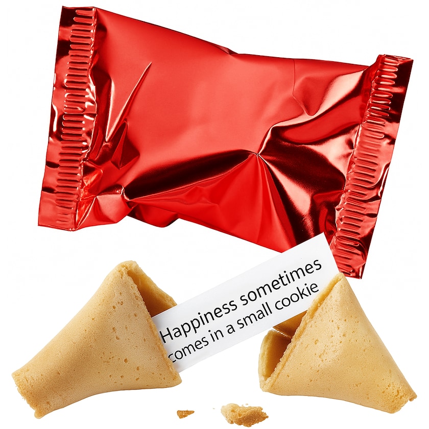 Lykkekage i flowpack med eget logo. Du vælger selv op til 5 forskellige budskaber som skal findes i kagerne. Hvert budskab kan bestå af op til 125 tegn inkl. mellemrum. Teksten trykkes i sort. Trykket placeres på flowpacken.