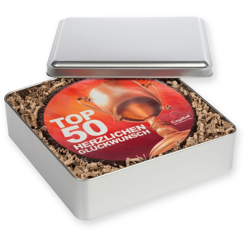 Stor chokoladebar med tryk på topsiden. Hele kagens topside trykkes med fuld fotorealisme helt efter dine ønsker. Leveres i en eksklusiv metalæske.