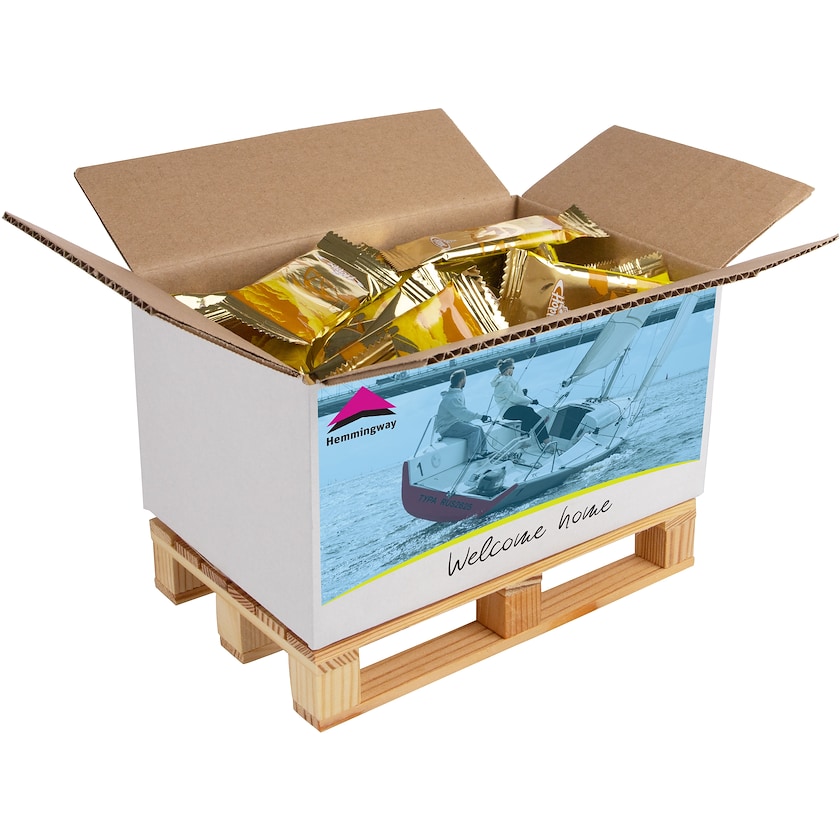 Flyttekasse på en træpalle fyldt med 60 kager. Kagerne er pakket ind i guldfarvet folie. Flyttekassen mærkes med to digitaltrykte etiketter på hver langside.