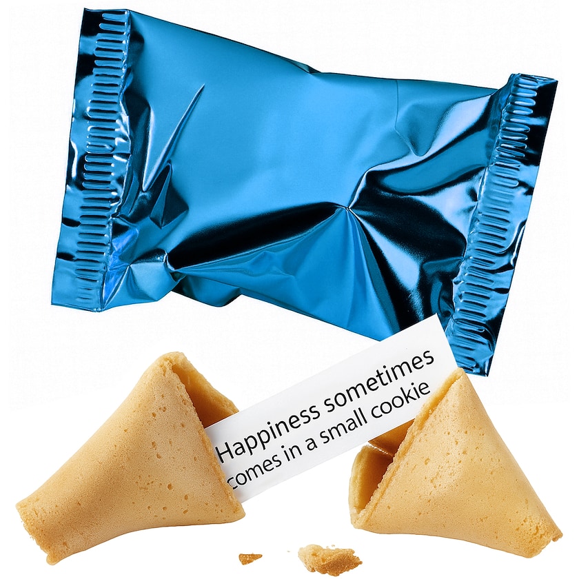 Lykkekager uden tryk. Du vælger selv op til fem forskellige budskab der findes i kagerne. Hvert budskab kan bestå af op til 125 tegn inklusiv mellemrum. Teksten trykkes i sort. Det er ikke muligt med tryk på selve folien.