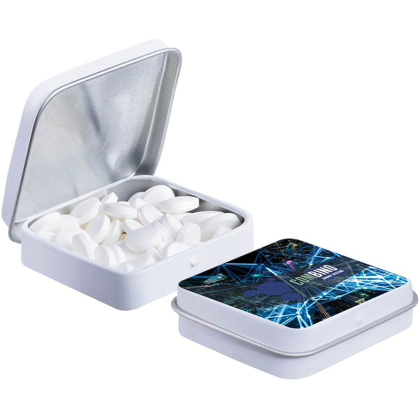 Metalæske med opfriskende mintpastiller. Hele låget trykkes med digitaltryk. Mintpastillerne har hele 36 måneders holdbarhed.