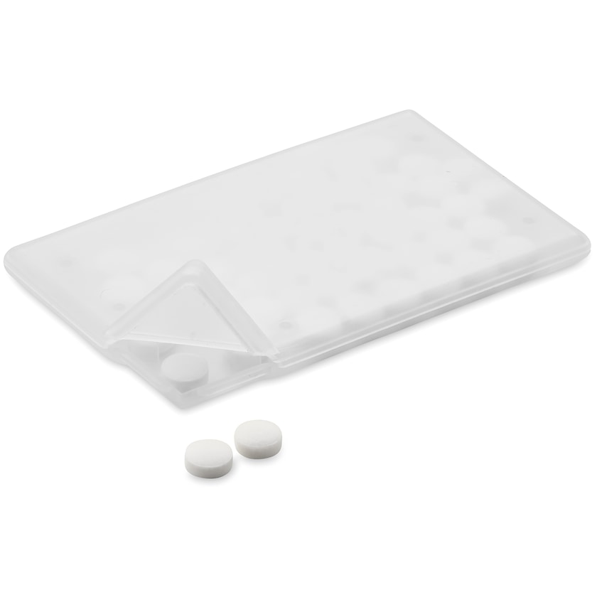 Rektangulær freshcard med sukkerfrie mintpastiller. Fås i flere transparente farver samt hvid. En klassiker indenfor reklameslik.