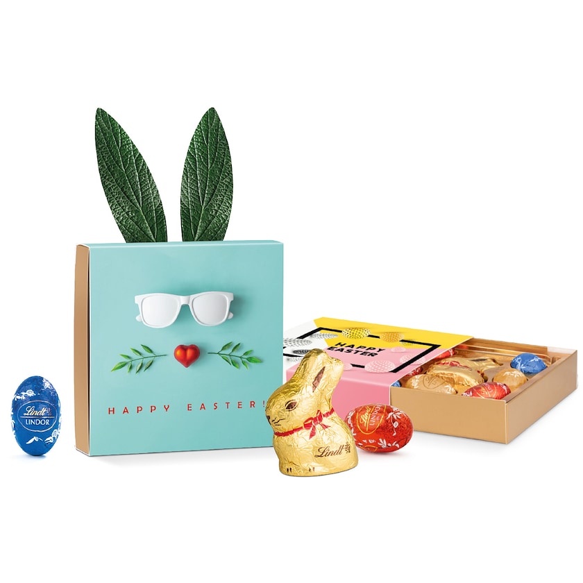 Æske med kaninører fyldt med chokolade fra Lindt. Indeholder 6 stk. Lindt chokoladeæg samt en Lindt påskehare med guldfolie. Kaninørerne og papæskens hylster trykkes helt efter dine ønsker.