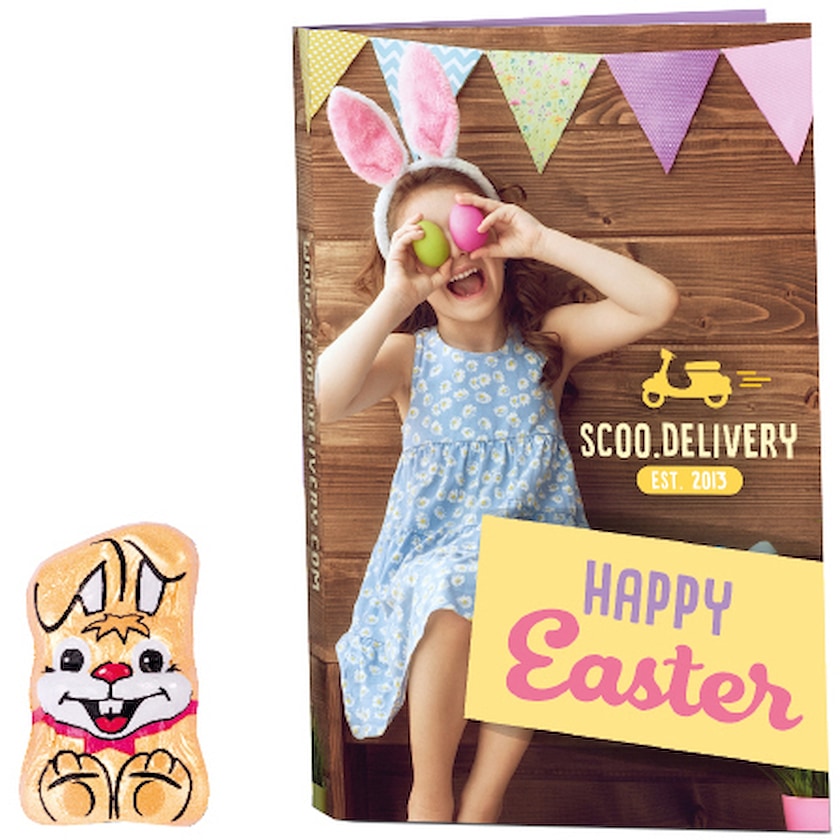 Kort med en påskehare i chokolade. Kortet digitaltrykkes efter dine ønsker. Her findes godt med plads til et kraftfuldt reklamebudskab!