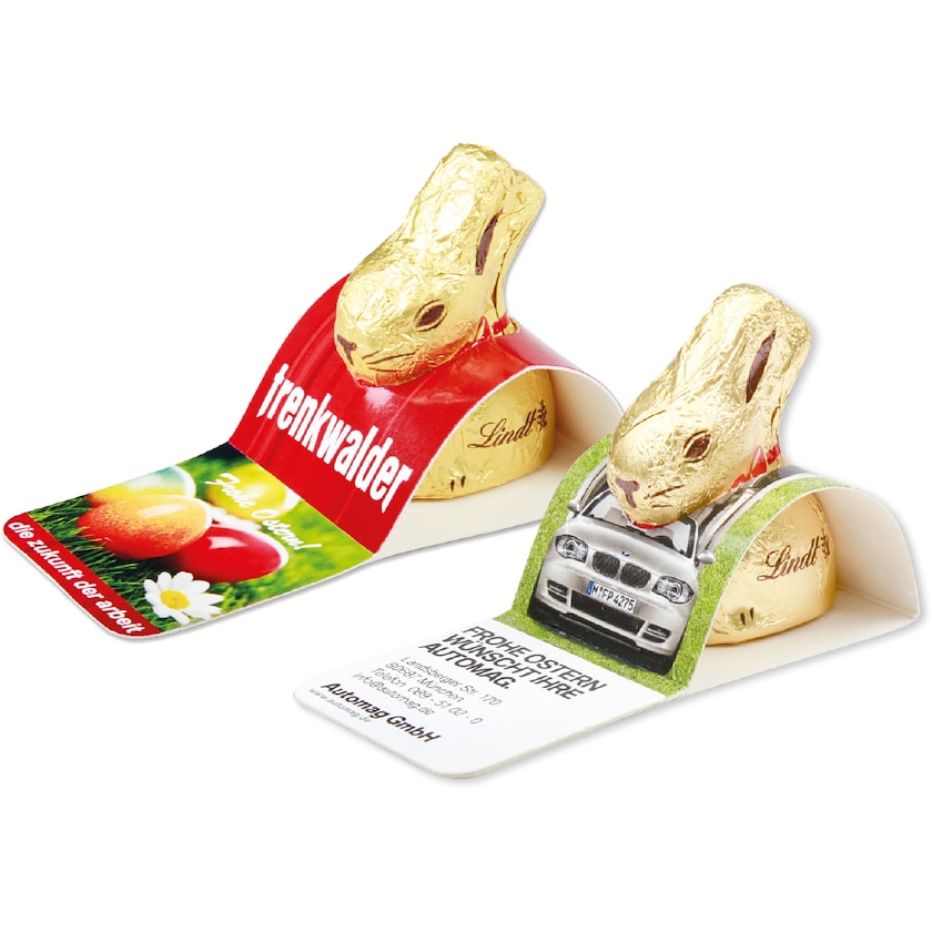 Påskehare fra Lindt med etiket af pap med dit eget logo. Etiketten er fremstillet af FSC-certificeret papir og trykkes helt efter dine instruktioner. Påskeharen er fremstillet af det fineste mælkechokolade. Påskens storfavorit!