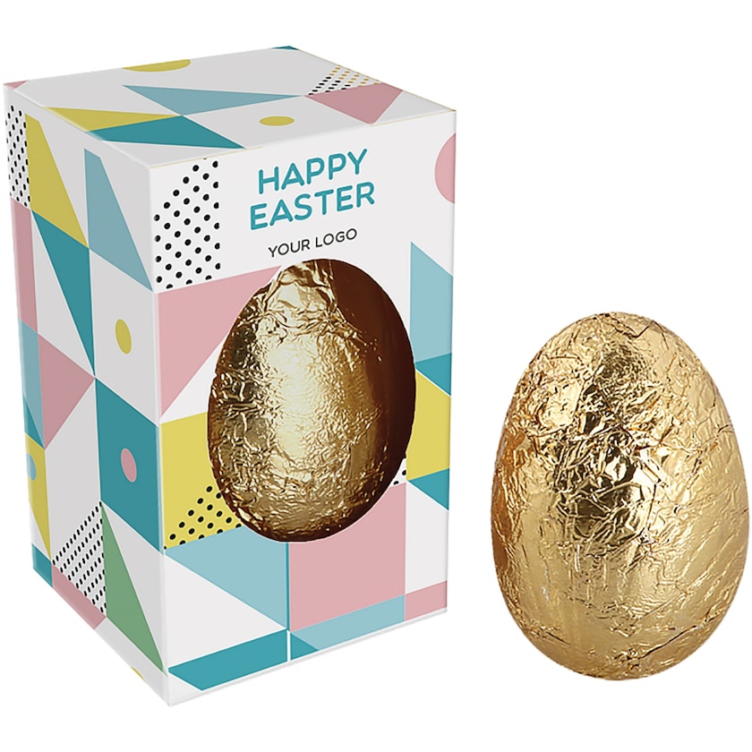 Chokoladeæg med guldfolie. Emballagen trykkes efter dine ønsker. Chokoladeægget er produceret i mælkechokolade. Perfekt til større kampagner!