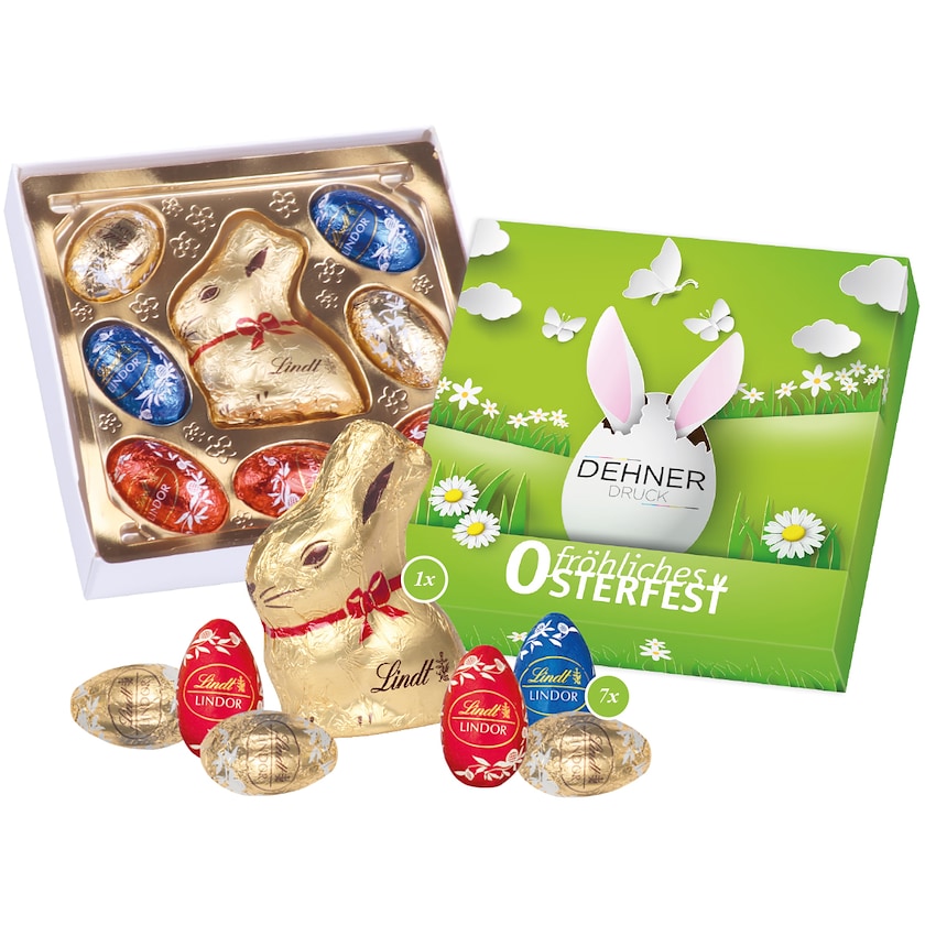 Chokoladeæske fyldt med påskechokolade fra Lindt. Overrask dine kunder! Chokoladeæsken er fremstillet af klimaneutralt og FSC-certificeret papir og indeholder 42 gram førsteklasses chokolade.