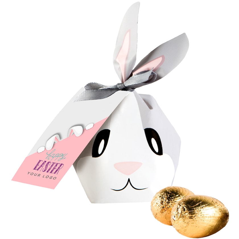 Pose designet som en sød hare der er fyldt med 5 chokoladeæg. Chokoladeæggene er indpakket i guldfarvet folie og vejer samlet 50 gram. Posen kommer med et papkort hvor forsiden trykkes helt efter eget ønske.