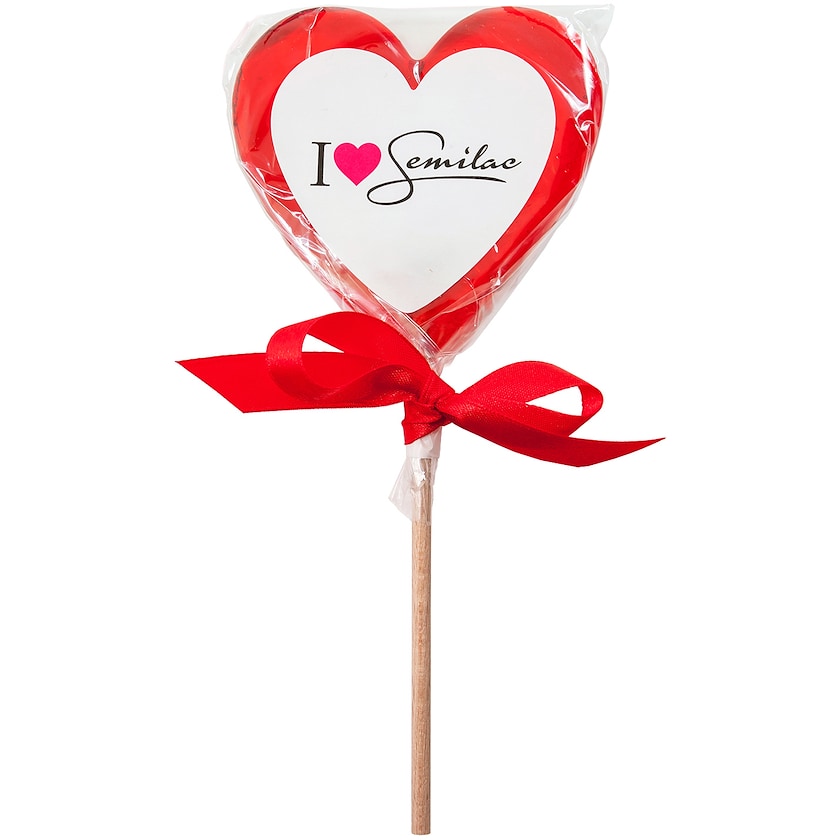 Stor hjerteformet slikkepind på 70 gram Trykket sker på den hjerteformede etikette. Plastikfolien er omsluttet med et rødt bånd.