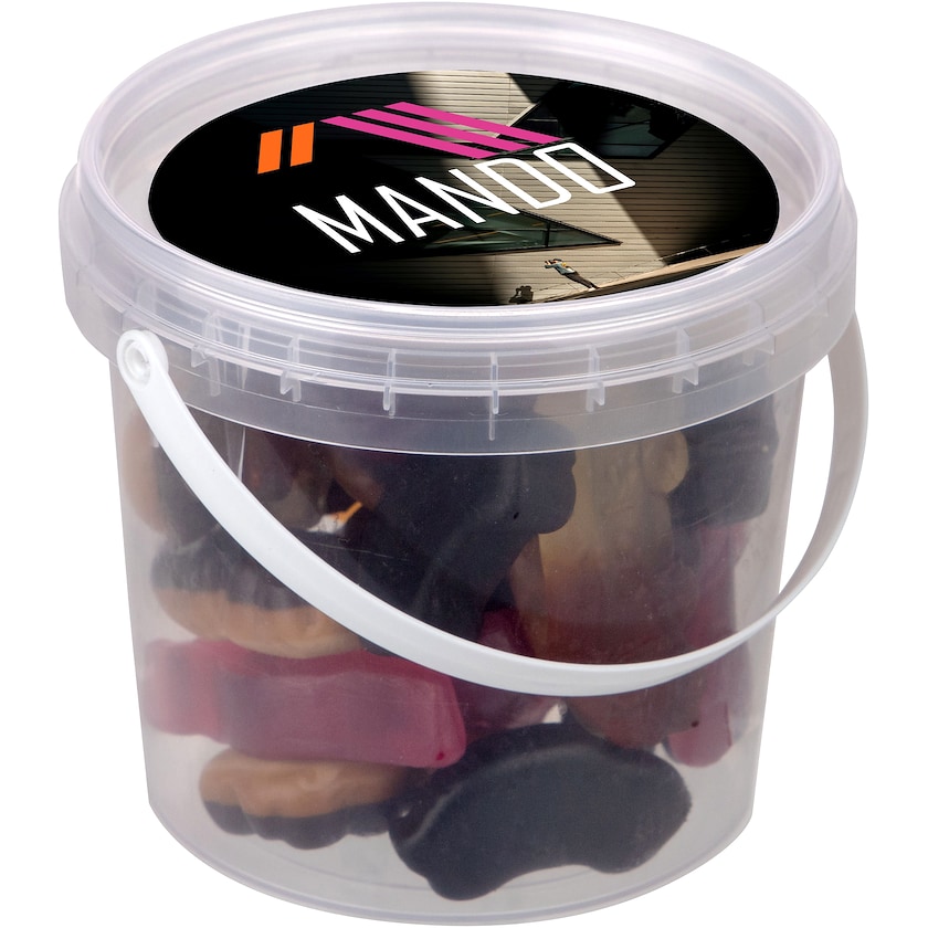 En lille spand fyldt med lakrids med biltema. Lakridsen fås i blandede smagsvarianter. Mærkningen sker med en digitalt trykt etiket på låget af spanden.