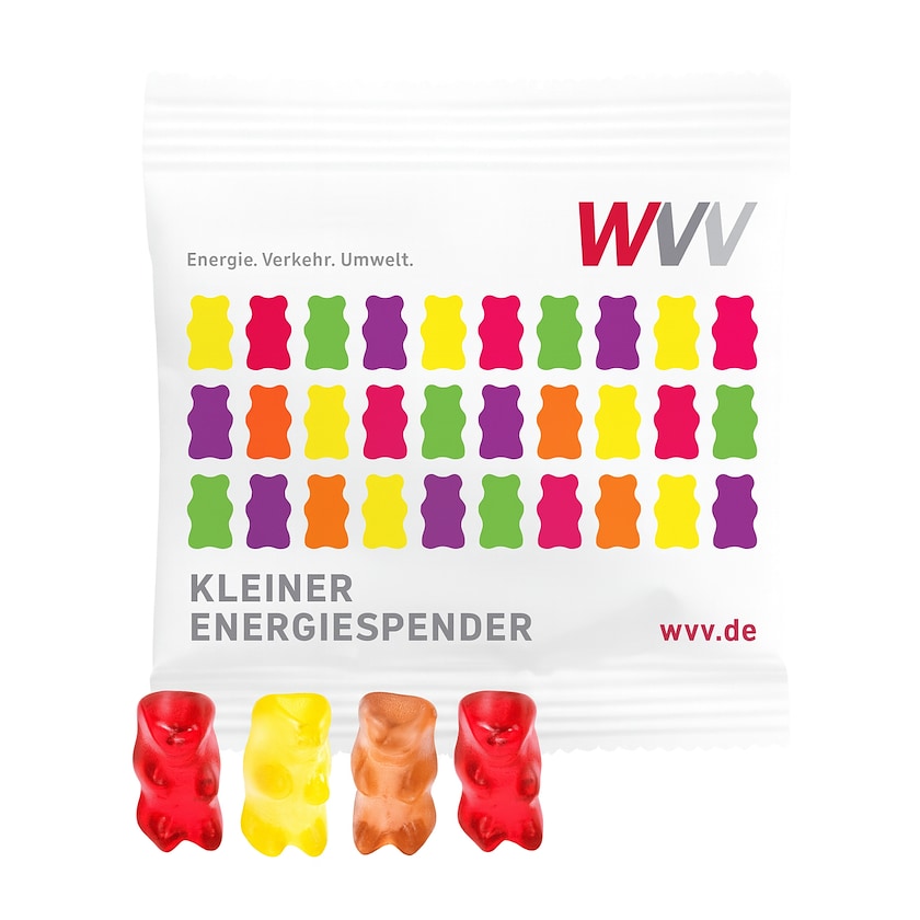 10 grams pose med vingummibamser som er mulig at bestille fra kun 1000 stk. Vingummibamserne har frugtsmag. Posen trykkes med digitaltryk helt efter dine ønsker. Indpakningen er hvid. Perfekt til messer, events eller udstillinger!