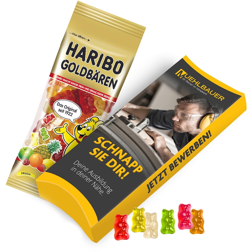 Papemballage med 75 grams slikpose fra populære Haribo. Hele papemballagen trykkes efter dine ønsker.