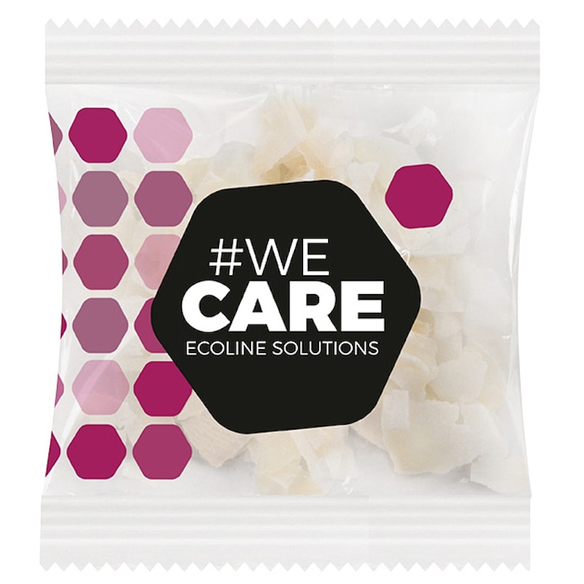 Lille flowpack banan- eller kokoschips. Et sundt alternativ! Hele pakken trykkes efter dine ønsker