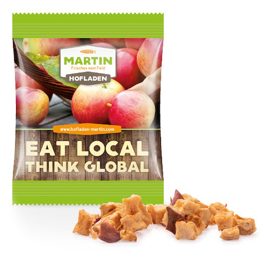 Lille pose med tørrede æblestykker. Et sundt og vegansk alternativ. Hele posen trykkes efter dine ønsker.