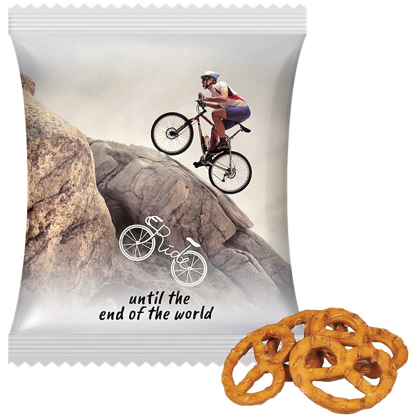 Pose med 10g saltede pretzels Leveres i flowpack med eget tryk. Et godt alternativ til slikket på messen!