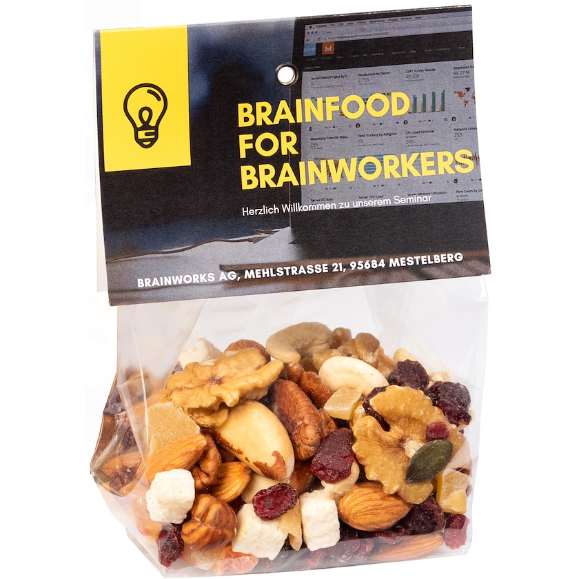 Naturslik i emballage med papetiket med dit logo. Naturslikket indeholder blandt andet tørrede tranebær, papaya, ananas, valnødder og kokos.