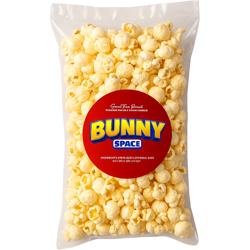 Pose med saltede popcorn som er klar til at spise. Et rundt klistermærke trykkes efter dine instruktioner og placeres på posens frontside.