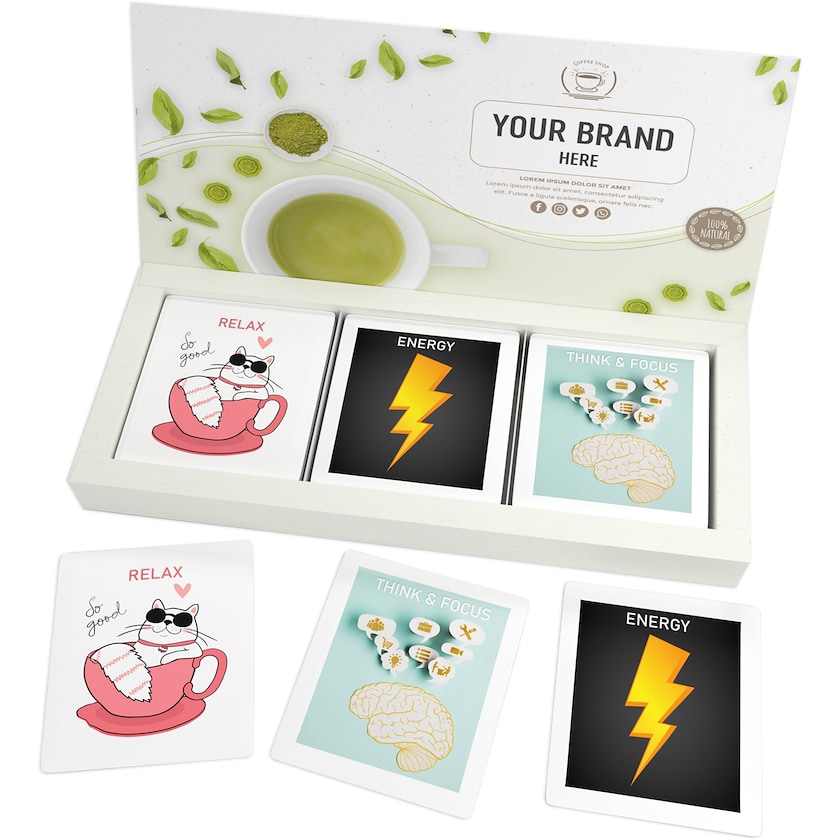 Sæt med 15 stk. teposer i papæske. Alt forsynes med dit tryk! Vælg mellem flere forskellige slags te. Du kan vælge op til tre forskellige slags te dvs. mindst 5 stk. teposer af hver slags.