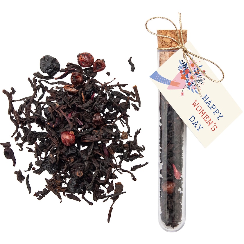Reagensglas fyldt med sort te. Teen har elementer af solbær. Reagensglasset er lavet af plast og låget af ægte kork. Trykket laves på kortet, som er fastgjort til reagensglasset med sølv- eller guldbånd.