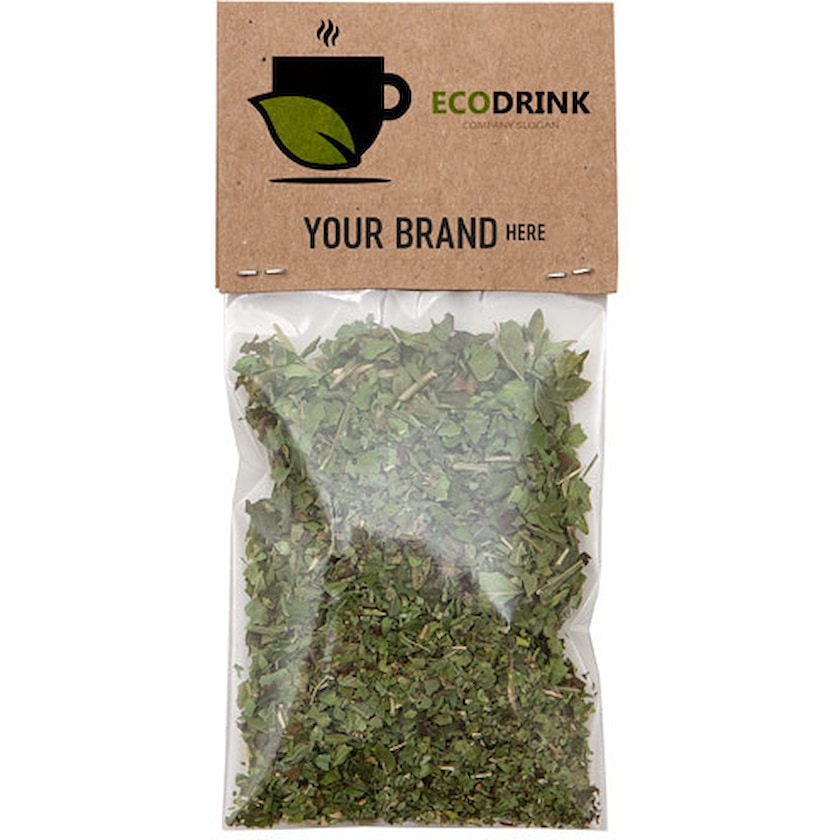 Tepose med økologisk te. Teposen har en naturfarvet pepetiket som trykkes efter dit ønske. Vælg mellem to forskellige tesorter. Rækker til tre tebrygninger.