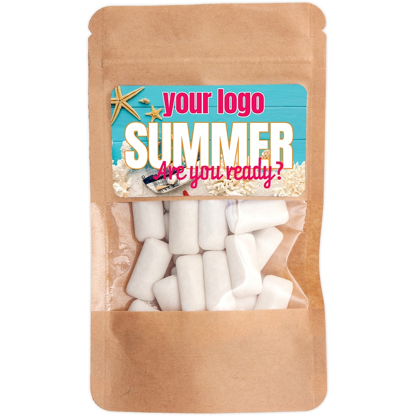 25 tyggegummier i naturfarvet pose med vindue. Et digitaltrykt klistermærke med dit logo placeres på poserne. På bagsiden er der en etiket med indholdsfortegnelse.