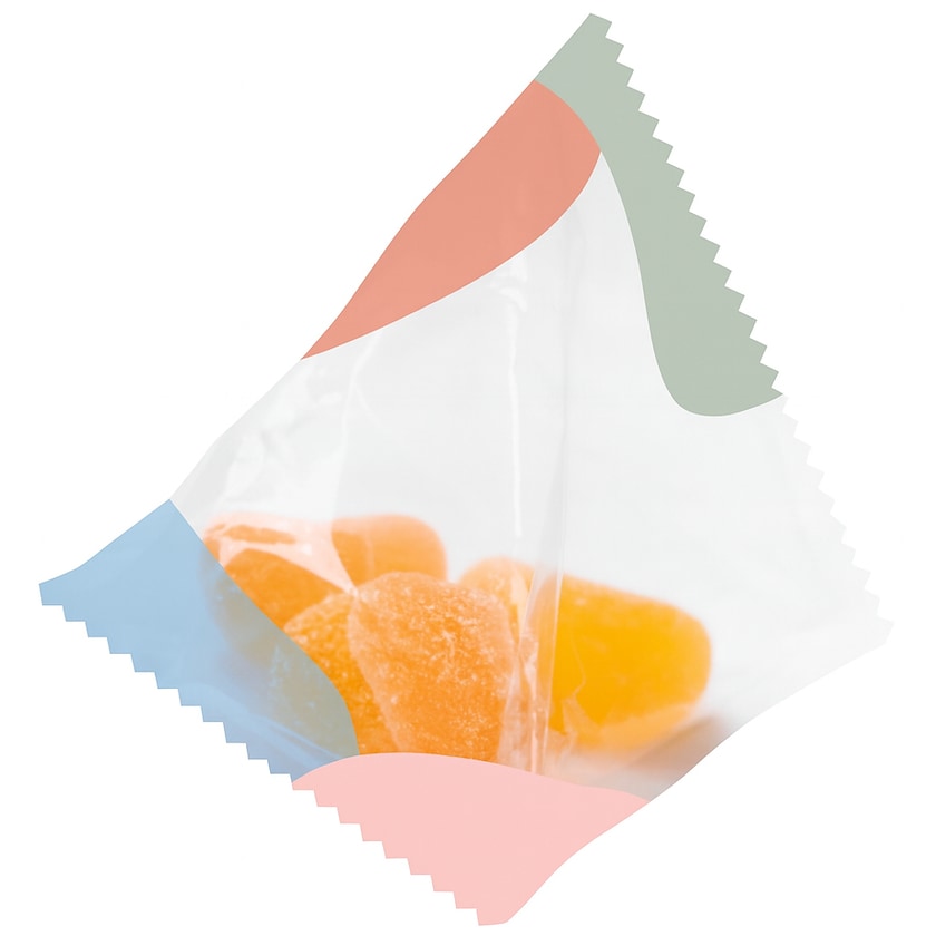 Pyramide med vingummi Pyramiden indeholder en lækker blanding af appelsin- og citrussmag. hele kuben trykkes efter dit ønske. Du vælger selv om du vil have at pyramiden fremstilles i transparent eller ensfarvet materiale.
