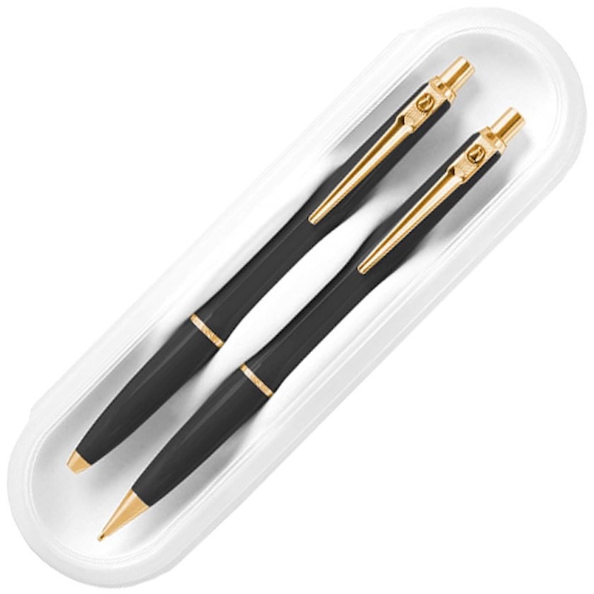 Ballograf Epoca P Luxe sæt med en kuglepen og en stiftblyant. Pennen har flotte forgyldte metaldele. Mærkningsprisen indikerer mærkning på en af pennene. Kuglepennen er forsynet med arkivbestandigt blæk af typen svensk arkiv.