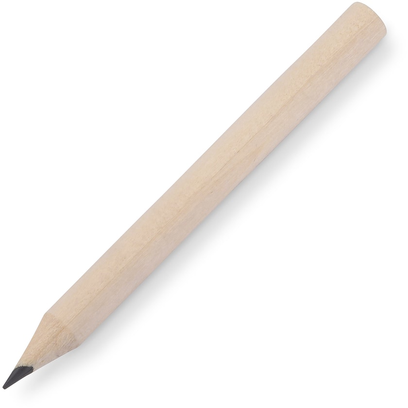 Kort blyant med logo. Pennen er naturfarvet og har en længde på 85 mm. Leveres spidset.