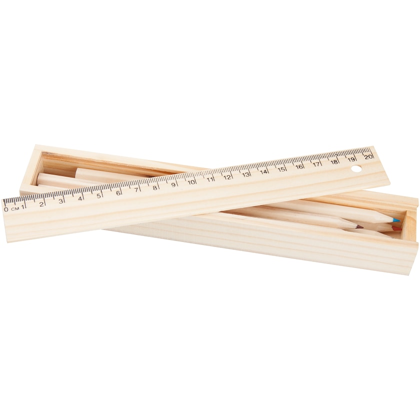 Sæt med 6 farveblyanter og linjal. Linjalen bruges som låg til sættet, og det er også der trykket kommer til at ske.