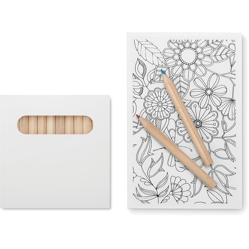 Sæt med farveblyanter og tegnesider til farvelægning. Sættet retter sig mest mod voksne og er perfekt til afkobling og mindfulness. Sættet indeholder 10 sider og 12 farveblyanter. Trykket laves på farveblyanternes papæske.