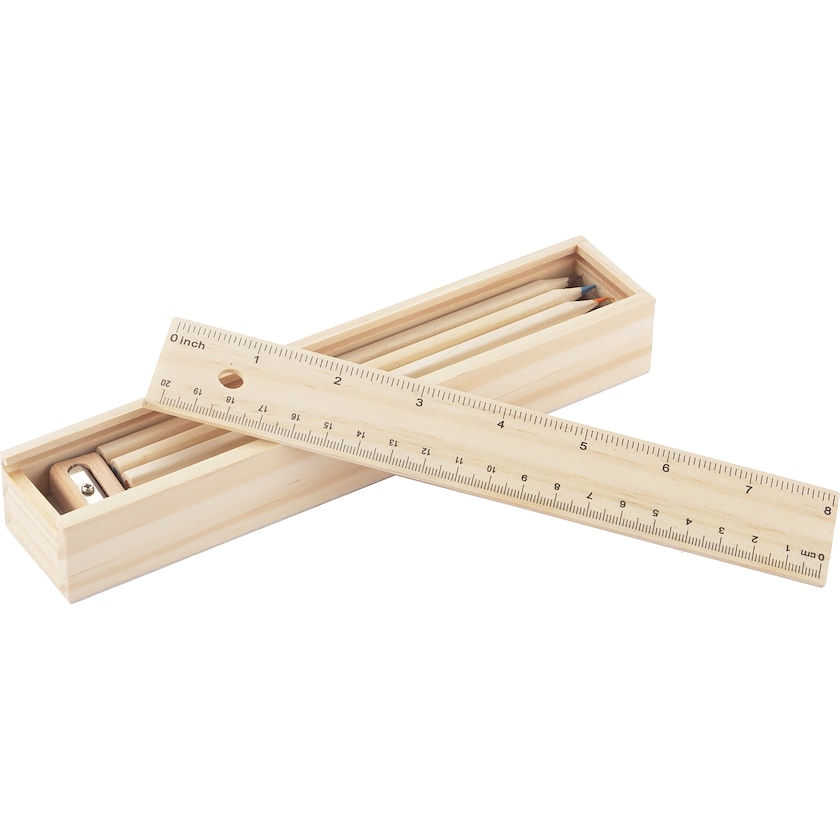 Sæt med 12 farveblyanter, linjal og viskelæder. Mærkningen sker på linjalen.