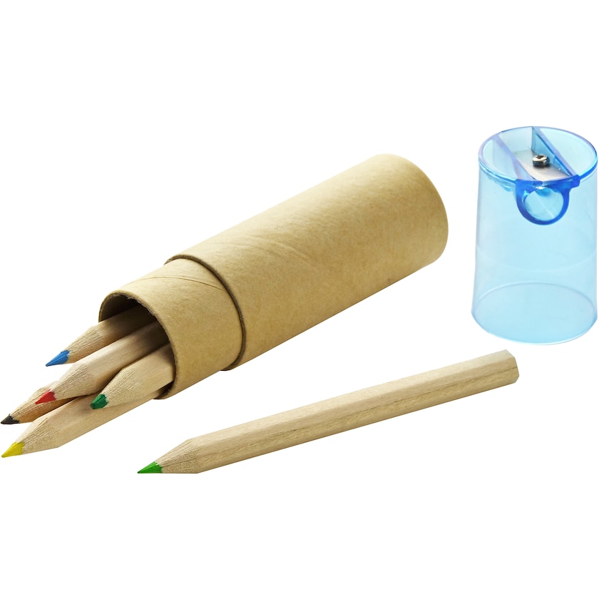 Rør med 6 farveblyanter og blyantspidser i låget. Trykket laves på paprøret.